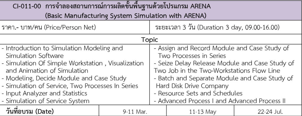 3. CI-011-00 การจำลองสถานการณ์การผลิตขั้นพื้นฐานด้วยโปรแกรม ARENA (Basic Manufacturing System Simulation with ARENA)