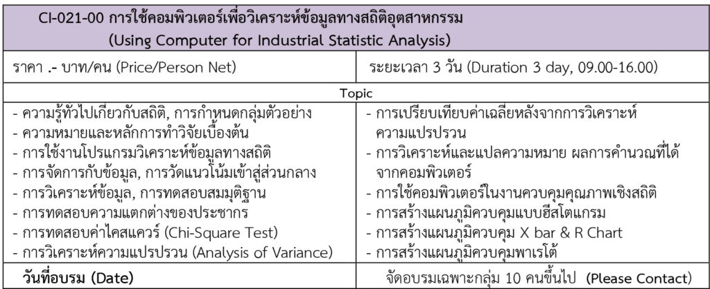 4. CI-021-00 การใช้คอมพิวเตอร์เพื่อวิเคราะห์ข้อมูลทางสถิติอุตสาหกรรม (Using Computer for Industrial Statistic Analysis)