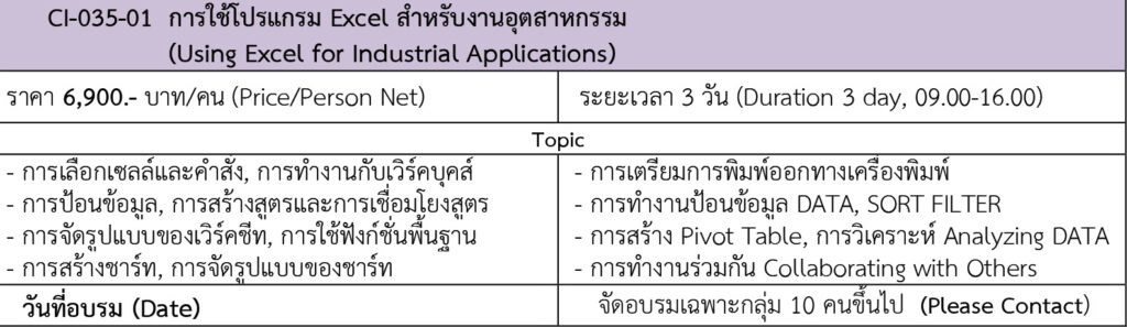 6. CI-035-01 การใช้โปรแกรม Excel สำหรับงานอุตสาหกรรม (Using Excel for Industrial Applications)