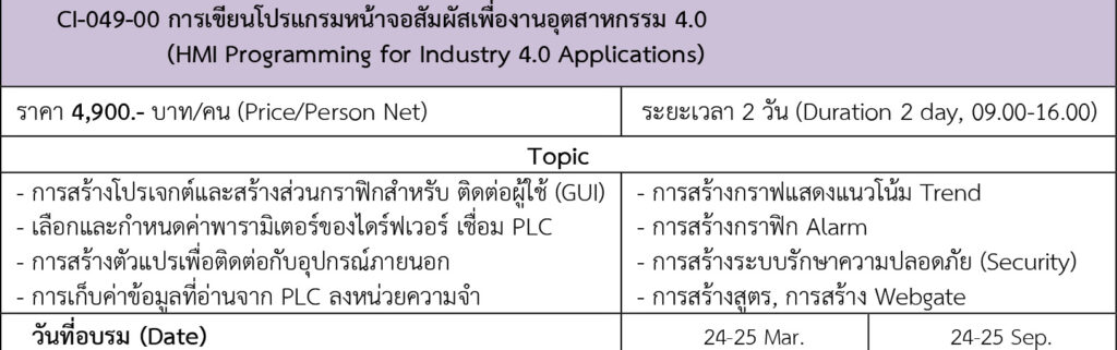 10. CI-049-00 การเขียนโปรแกรมหน้าจอสัมผัสเพื่องานอุตสาหกรรม 4.0 (HMI Programming for Industry 4.0 Applications)