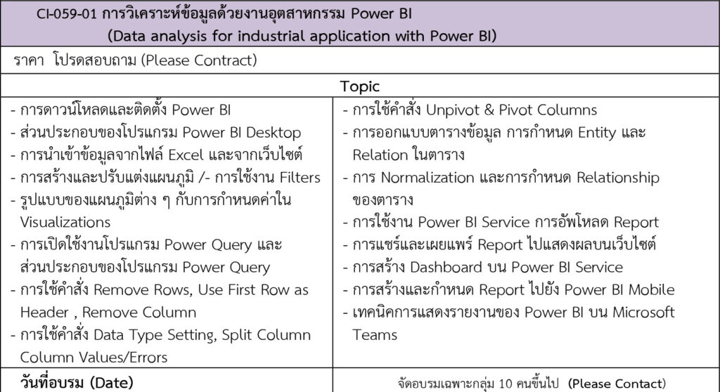 11. CI-059-01 การวิเคราะห์ข้อมูลด้วยงานอุตสาหกรรม Power BI (Data analysis for industrial application with Power BI)