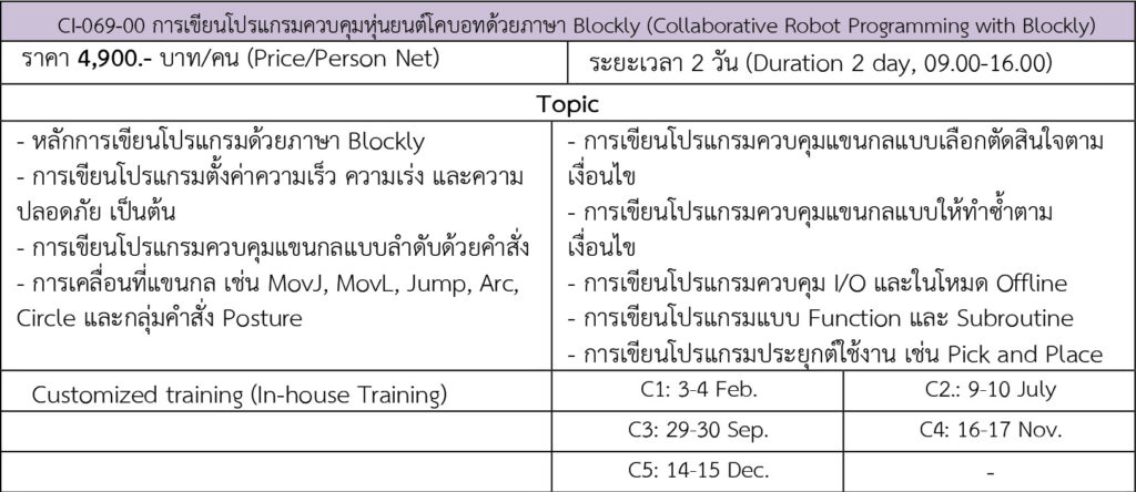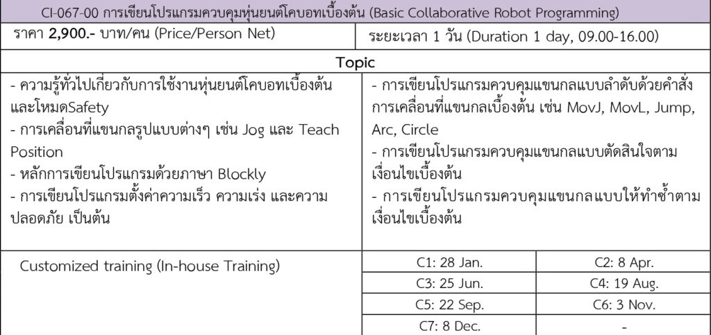 15. CI-067-00 การเขียนโปรแกรมควบคุมหุ่นยนต์โคบอทเบื้องต้น (Basic Collaborative Robot Programming)
